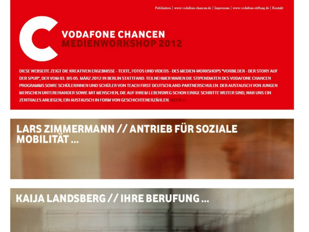 Vodafone-Chancenwww.chancen-medienworkshop.de Auftraggeber: Vodafone Stiftung Deutschland gGmbH System: Synapsis URL: www.chancen-medienworkshop.de « Zurück